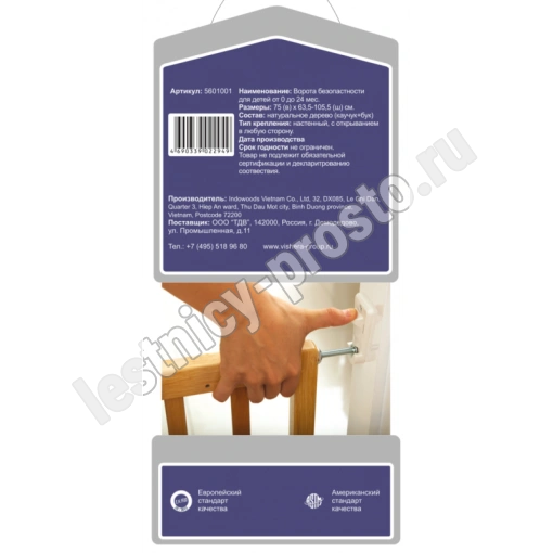 Изделие имеет раздвижную конструкцию с большим диапазоном - от 63.5 до 105 см и может быть установлено в любые дверные или лестничные проемы,  в качестве основного материала используется натуральное дерево (бук) с высококачественной  шлифовкой.