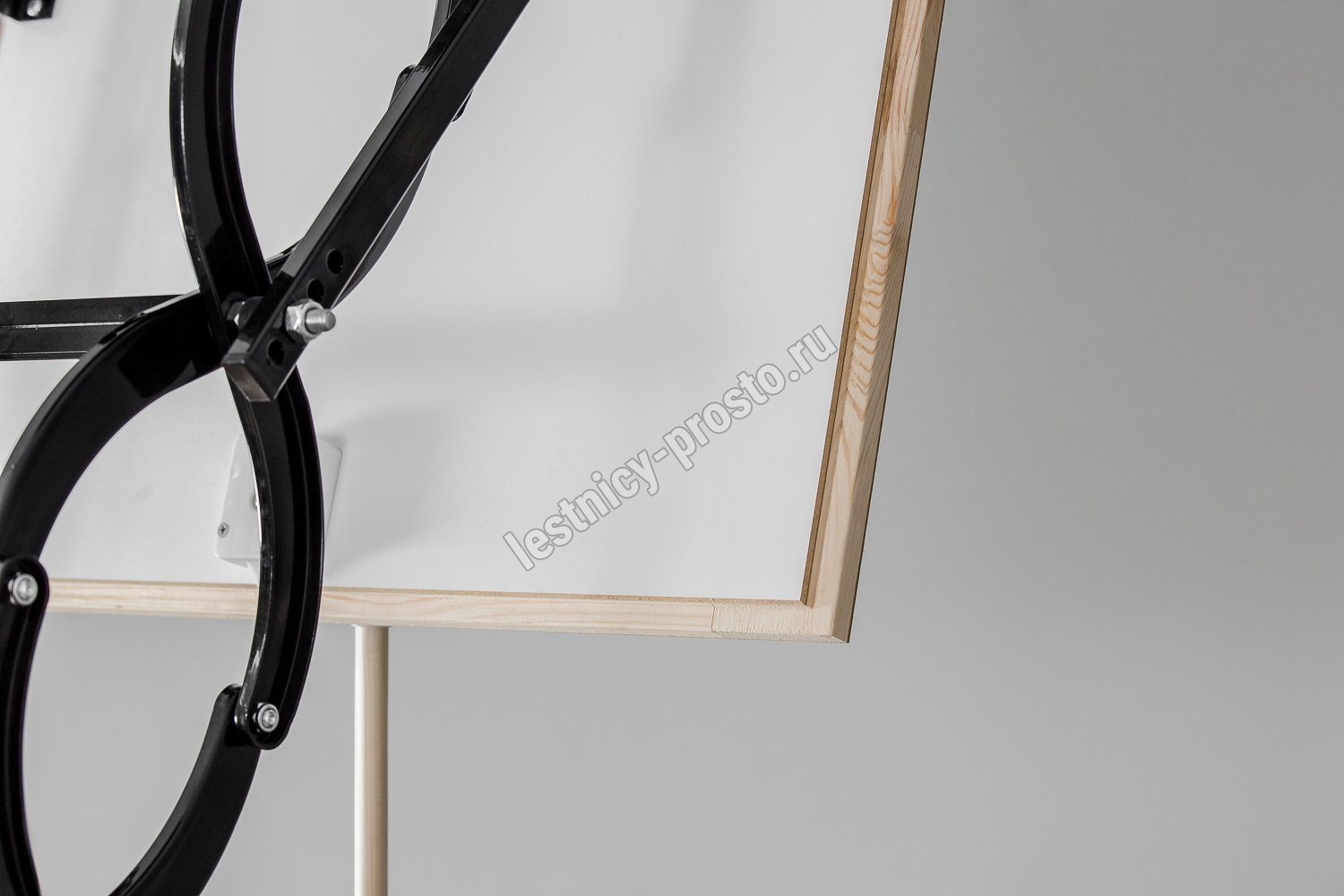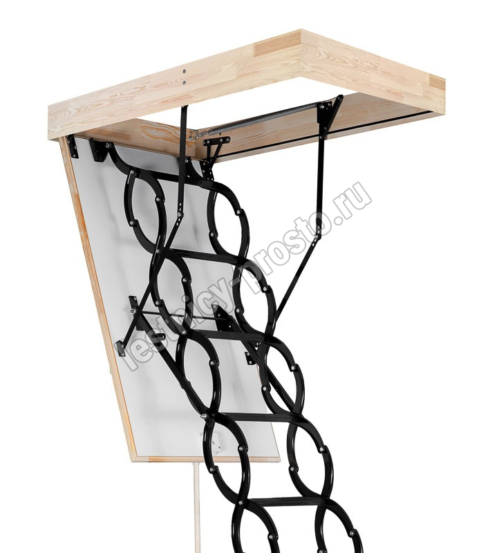 Термоизоляционная крышка типа "сэндвич" облицована с двух сторон ДСП белого цвета. Конструкция лестницы изготовлена из анодированной стали.