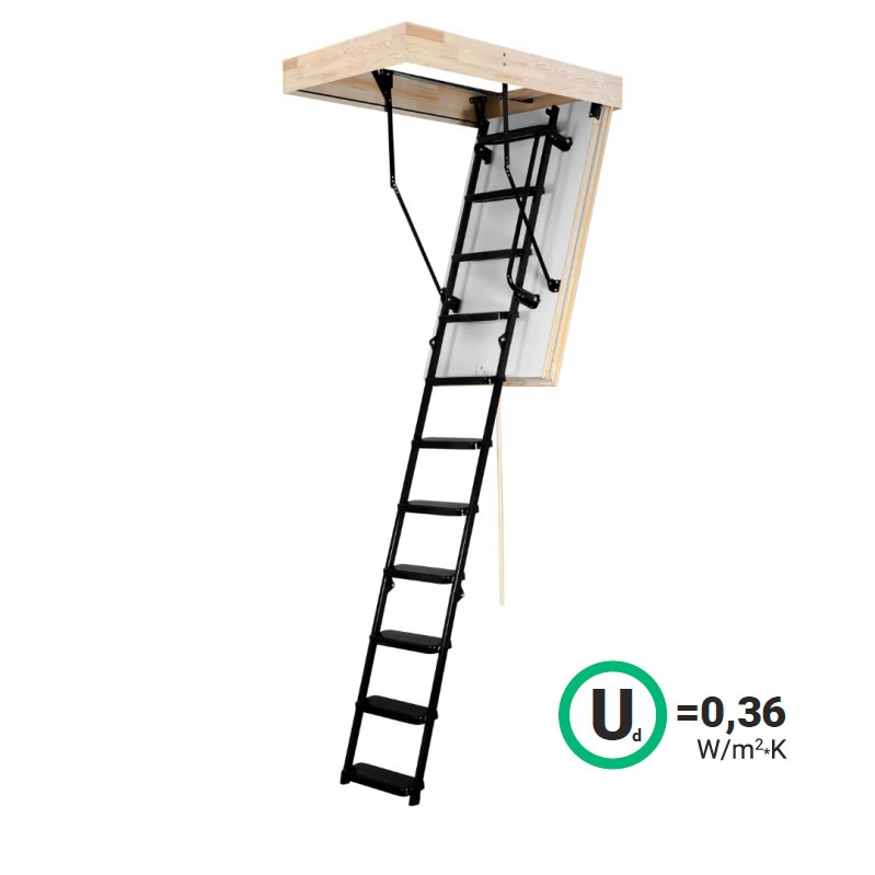 Лестница складная трехсекционная. Рабочая поверхность полностью выполнена из металла и покрашена порошковой краской. Термоизоляционная крышка типа "сэндвич", толщиной 86 мм, утеплена пенопластом, облицована с двух сторон ДCП белого цвета.