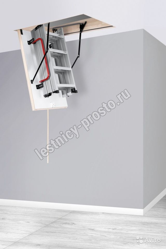 Складная 4-х секционная чердачная лестница. Рабочая поверхность полностью выполнена из алюминия. Термоизоляционная крышка типа "сэндвич" имеет усиленную теплозащиту, облицована с двух сторон ДВП белого цвета. По контуру короба имеется уплотнитель; Все металлические элементы лестницы покрыты порошковой краской.