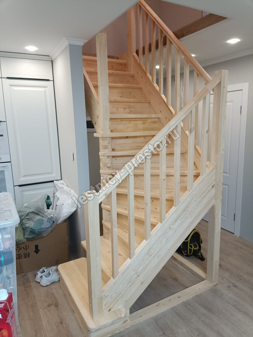 Базовый комплект включает в себя деревянные элементы лестницы с подступенками и ограждения без какого-либо покрытия.