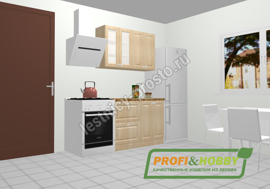 Компактный кухонный гарнитур из 100% массива сосны шириной 1,2 и высотой 2,14 метра (верхние шкафы высотой 72 см). Подойдёт для небольшой кухни, квартиры-студии или загородного дома.