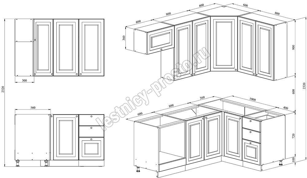 Благодаря модульной системе такая кухня может быть собрана зеркально, а, например, верхние шкафчики "под стекло" и "глухие" заменены местами. В стандартной комплектации нижние тумбы оснащены регулируемыми ножками высотой 100 мм и цоколем из массива сосны 95 мм.