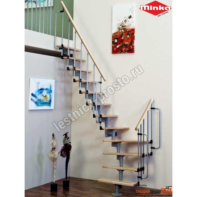Поручень лестницы JOKER 700 покрыт порошковым покрытием "под дерево", в тон ступеням. Ступени изготовлены из бука и покрыты износостойким фирменным защитным лаком Minka.