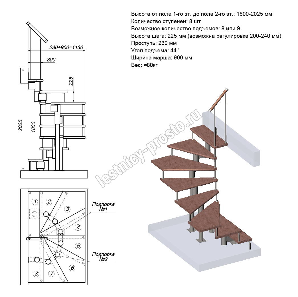 Высота лестницы 1800 - 2025 (8 ступеней) мм