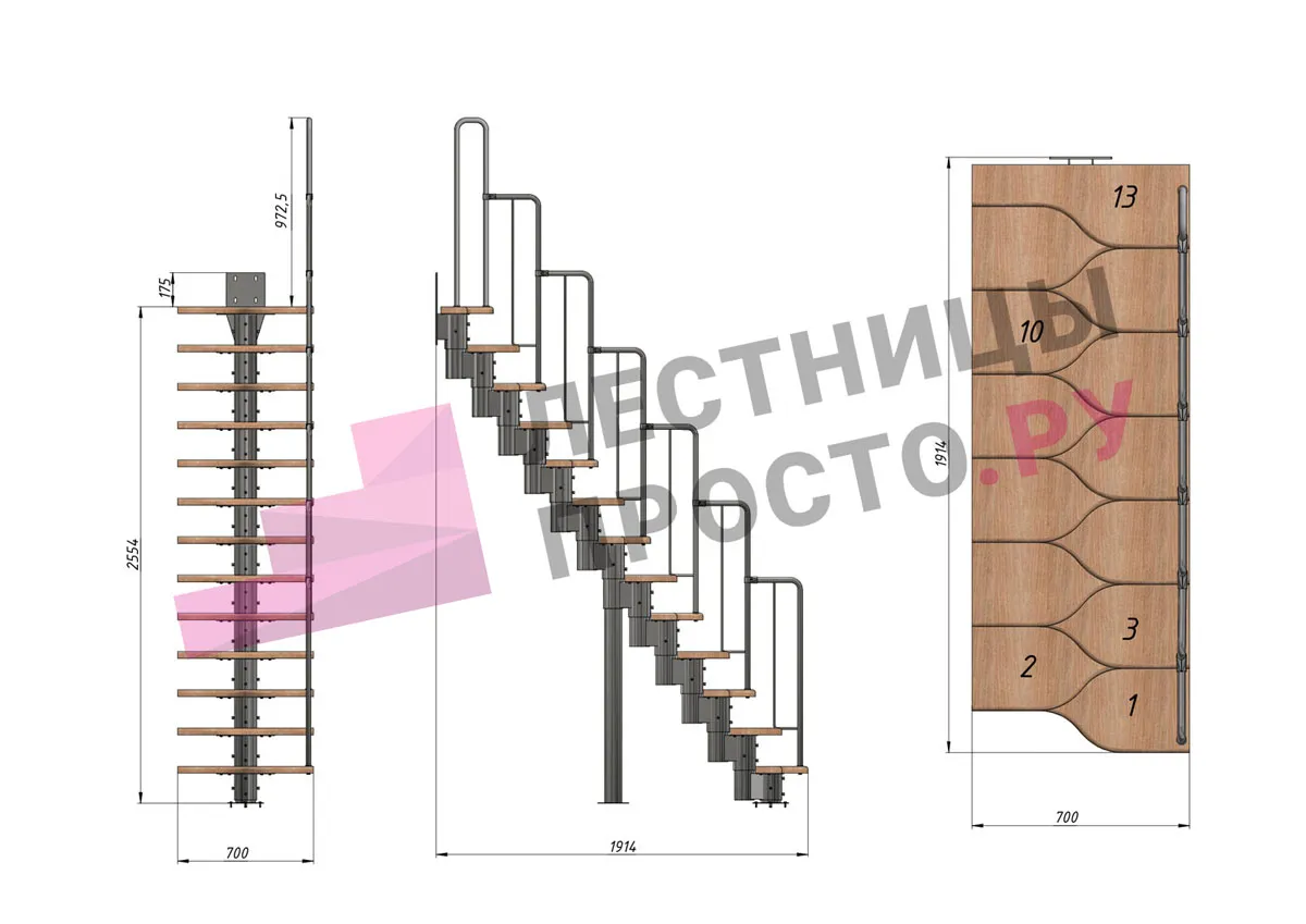 Лестница Prosto Urban Black гусиный шаг 700 мм, h234-336 см (13 ступеней), бук
