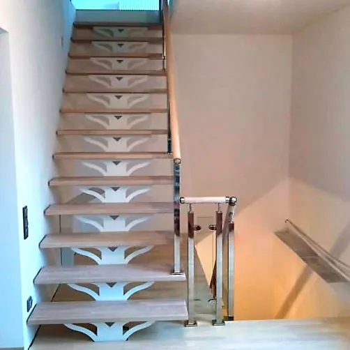 соответствует картинке, но вы не ограничены в его выборе. Лестницу можно приобрести и без ограждения, и с любым другим. Устанавливать на такую лестницу можно почти всё, начиная от классических деревянных балясин и заканчивая эксклюзивными коваными изделиями.