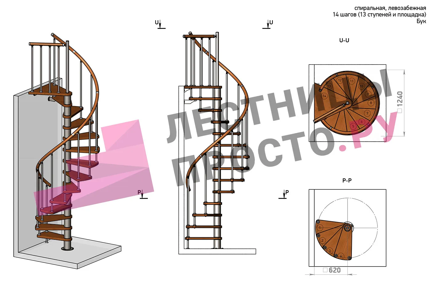 Левая, d=120см, 13 ступеней + площадка