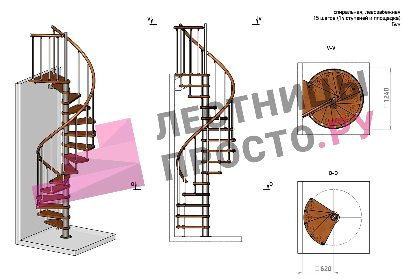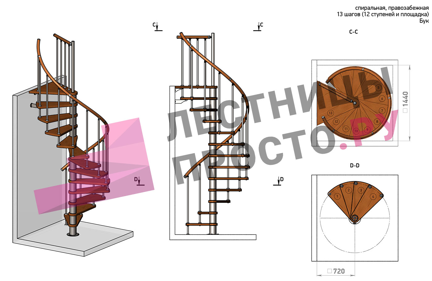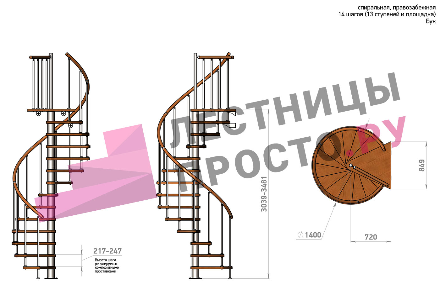 | Винтовая лестница Prosto Spiral White D140см, h303.9-348,1 см, бук |