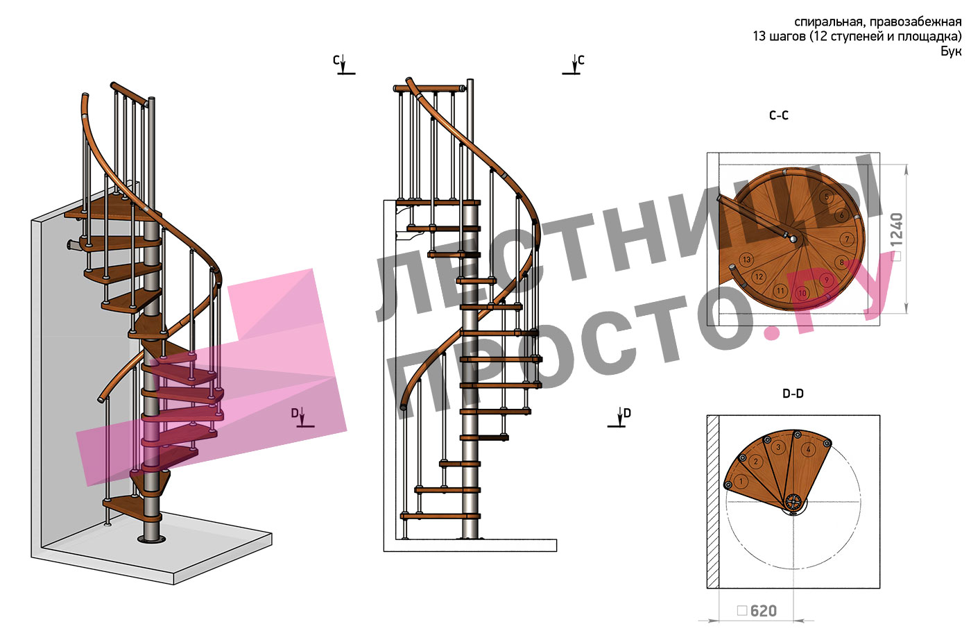 | Винтовая лестница Prosto Spiral White D120см, h282.2-326,3 см, бук |