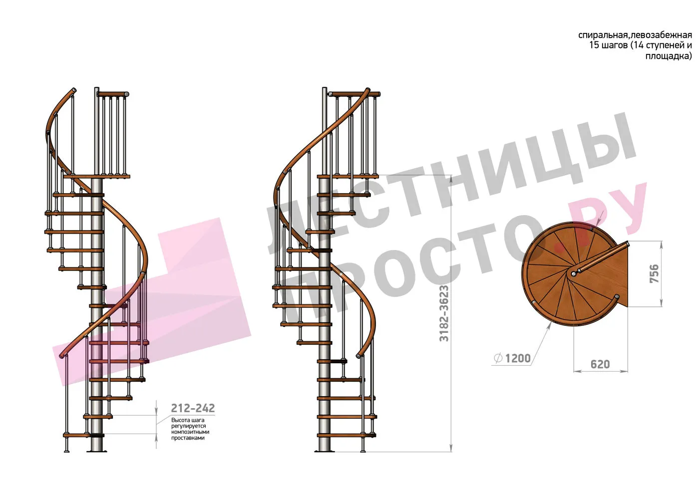 Высота ступеней регулируется с шагом 3 мм. в пределах 212-242 мм., благодаря чему, лестница прекрасно подгоняется под необходимую высоту.