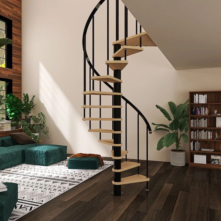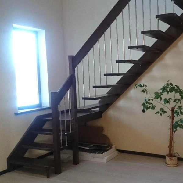 Компактная надёжная лестница. Ступени толщиной 30 мм, изготовлены из массива берёзы по технологии Multiplex, лакированные. Все металлические части оцинкованы горячим способом и покрыты порошковой краской - черного цвета; Лестница имеет надёжную несущую стальную конструкцию.