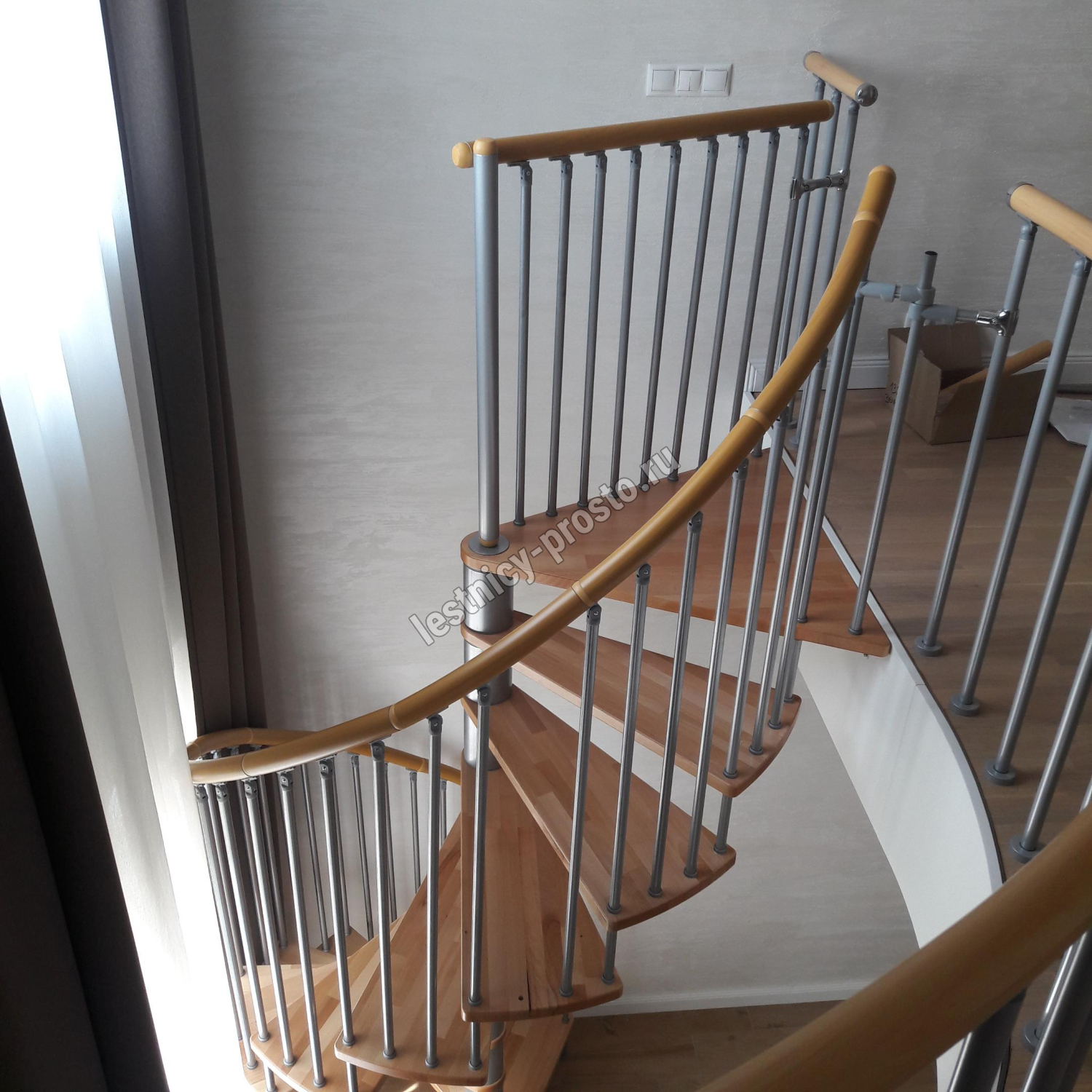 Поручень изготовлен из массива дуба в тон ступеням. Поручень и ступени лестницы покрыты износостойким защитным лаком.